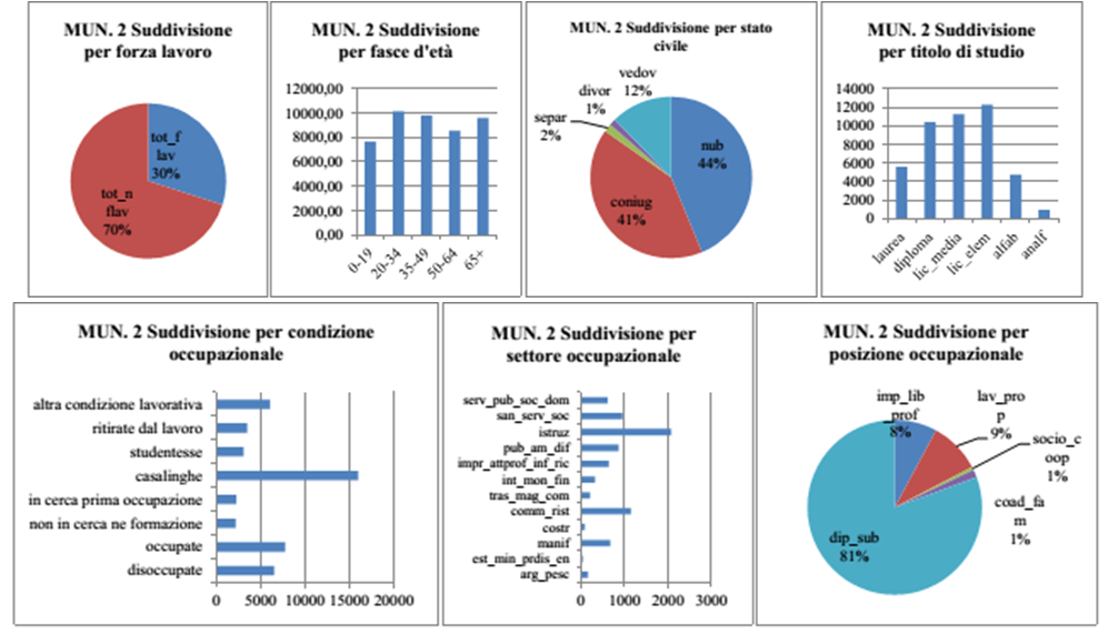La municipalità 2 (Avvocata, Montecalvario, Mercato, Pendino, Porto, San Giuseppe) conta circa 48.124 unità (9,19% della popolazione femminile totale). Il 30% delle donne residenti si dichiara forza lavoro. L’età risulta distribuita in maniera bilanciata rispetto alle fasce proposte, con preponderanza di giovani. Prevalgono nubili, seguono le coniugate. Il titolo di studio è medio-basso (dalla licenza elementare al diploma). Prevalgono le casalinghe, seguite dalle occupate, preponderantemente di basso profilo (81%) e prevalentemente nei settori istruzione, commercio, sanità e manifattura. (Fig 1)