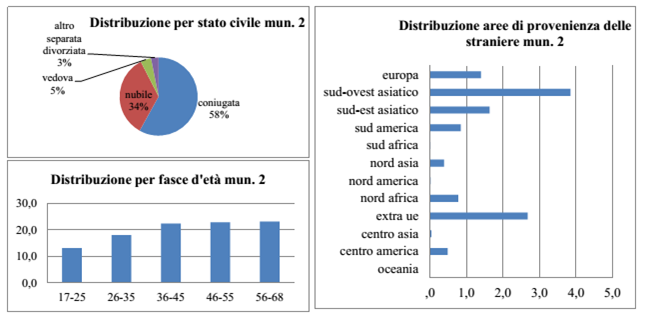 La municipalità 2 (Avvocata, Montecalvario, Mercato, Pendino, Porto, San Giuseppe) conta circa 32.862 unità tra i 17 ed i 68 anni (9,7% della popolazione femminile totale). Di queste, il 58% risulta celibe, il 34% nubile e residuali risultano le restanti categorie. Questo giustificato anche dall’elevata età media delle donne di questa municipalità che si concentra nelle fasce tra i 36 e i 68 anni. In merito alle aree di provenienza per le straniere, prevalgono le donne provenienti dai paesi sud asiatico, seguite da quelle provenienti dai paesi extra UE e su americane. Ciò in controtendenza rispetto all’andamento generale registrato. Inoltre, rifacendoci ai dati 2001, circa il 30% delle donne residenti si dichiarava forza lavoro attiva, il titolo di studio risultava medio-basso (dalla licenza elementare al diploma) e prevalevano nettamente le casalinghe, seguite dalle occupate, per lo più di basso profilo (81%) e prevalentemente nei settori istruzione, commercio, sanità e manifattura. (Fig 3)