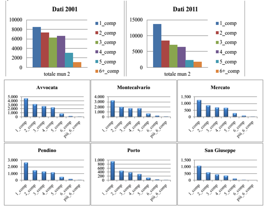 La municipalità 2 (Avvocata, Montecalvario, Mercato,Pendino, Porto, San Giuseppe)è una zona più centrale e caratterizzata dalla crescita di presenza di studenti, lavoratori precari e mobili, ma anche immigrati, che progressivamente va limando la presenza di nuclei familiari di vecchia data. I costi delle case restano alti, ma queste sono molto meno curate in quanto ad alto ricambio, e proprio l’alto ricambio consente una maggiore accessibilità economica anche per i più giovani. Rispetto al ranking cittadino, tuttavia, la municipalità 2 incalza come presenza di famiglie, ma come si può constatare sono tutte quelle con un solo componente che non fanno crescere proporzionalmente la municipalità anche a livello di residenti effettivi. (Fig 2)